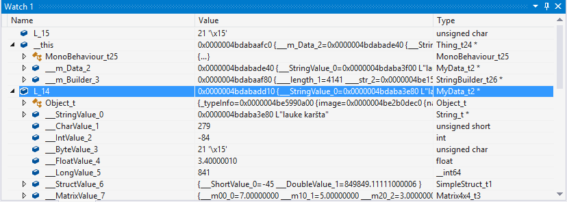 观察静态字段有点困难。在 IL2CPP 中,静态字段存储在 Il2CppClass 实例本身上。因此,为了观察静态字段,我们首先需要一个指向该类型 Il2CppClass 结构的指针。这些指针位于使用它们的方法的作用域内,但在观察一次之后,指针将在应用程序运行期间保持在相同的内存地址。Il2CppClass 结构具有“static_fields”字段,该字段便是一个指针,指向包含该特定类型的静态字段的内存块。要查看实际值,必须将此指针强制转换为适当的静态字段结构:每种类型都有自己的字段。例如,我们来观察 Thing_t24 类的静态字段: