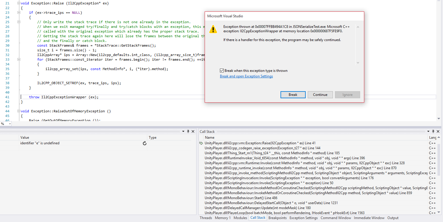 IL2CPP 使用本机 C++ 异常来实现 .NET 异常。当应该抛出某种异常时,IL2CPP 将抛出 Il2CppExceptionWrapper 对象,其定义如下: