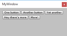void OnGUI() { // area to layout our items in var rect = new Rect(10, 10, position.width - 20, position.height - 20); // items to layout var items = new List<string> { "One button", "Another button", "Yet another", "Hey there's more", "More!" }; // get resulting rectangles of items var style = EditorStyles.miniButton; var boxes = EditorGUIUtility.GetFlowLayoutedRects(rect, style, 4, 4, items); // do actual UI for them for (var i = 0; i < boxes.Count; ++i) { GUI.Button(boxes[i], items[i], style); } } }