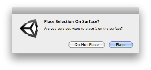 if (transforms.Length > 0 && EditorUtility.DisplayDialog("Place Selection On Surface?", "Are you sure you want to place " + transforms.Length + " on the surface?", "Place", "Do Not Place")) { foreach (Transform transform in transforms) { RaycastHit hit; if (Physics.Raycast(transform.position, -Vector3.up, out hit)) { transform.position = hit.point; Vector3 randomized = Random.onUnitSphere; randomized = new Vector3(randomized.x, 0F, randomized.z); transform.rotation = Quaternion.LookRotation(randomized, hit.normal); } } } } }