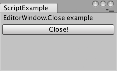 public class ScriptExample : EditorWindow { [MenuItem("Example/Close() Example")] static void Init() { ScriptExample window = (ScriptExample)EditorWindow.GetWindowWithRect(typeof(ScriptExample), new Rect(0, 0, 200, 100)); window.Show(); }