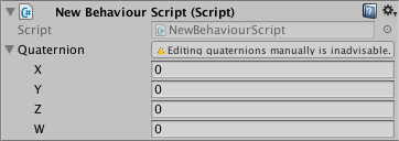 // display a warning to discourage users from manually editing child properties on a quaternion if (property.isExpanded) { position.height = EditorGUIUtility.singleLineHeight; position.xMin += EditorGUIUtility.labelWidth; EditorGUI.HelpBox(position, "Editing quaternions manually is inadvisable.", MessageType.Warning); } } }